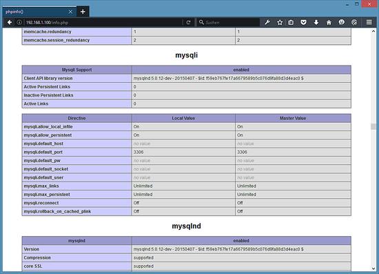 Laden Sie nun http://192.168.1.100/info.php in Ihrem Browser neu und scrollen Sie erneut nach unten zum Modulbereich. Sie sollten dort nun viele neue Module finden, darunter das mysqli- und mysqlnd-Modul: