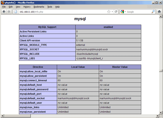 Laden Sie nun http://192.168.0.100/info.php in Ihrem Browser neu und scrollen erneut herunter zur Modulsektion. Dort sollten Sie jetzt viele neue Module finden, einschließlich des MySQL Moduls: