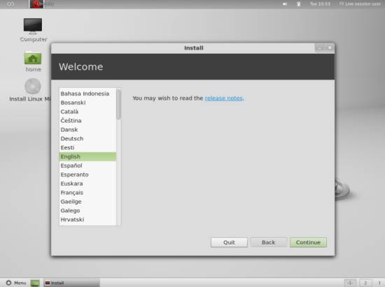 Die Linux Mint Installationshilfe wird automatisch den freien Speicherplatz zu einem gängigen Linux Volumeformat formatieren. Legen Sie Ihr Installationsmedium ein und starten den Computer davon. Um mit der Installation zu beginnen, klicken Sie auf Install Linux Mint: