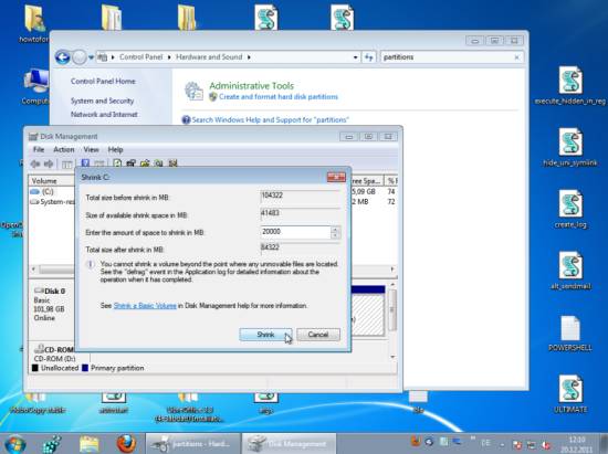 Sie werden kurz darauf warten müssen, dass der Rechner den größten schrumpfbaren Speicher ermittelt: