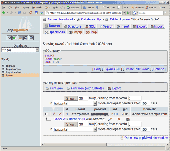 Für die Meisten ist es einfacher, wenn sie ein grafisches Frontend zu MySQL haben; dazu kannst Du ebenfalls phpMyAdmin verwenden (in diesem Beispiel unter http://server1.example.com/phpmyadmin/) um die ftp Datenbank zu verwalten.