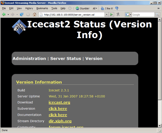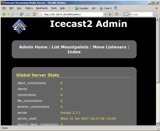 Das war’s schon. Nun können wir den Icecast2 Server starten: