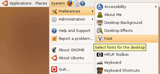 Nun müssen wir GNOME mitteilen, welche Schriftarten es für Programme, für den Desktop, Fenstertitel usw. verwenden soll. Gehe zu System > Preferences > Font: