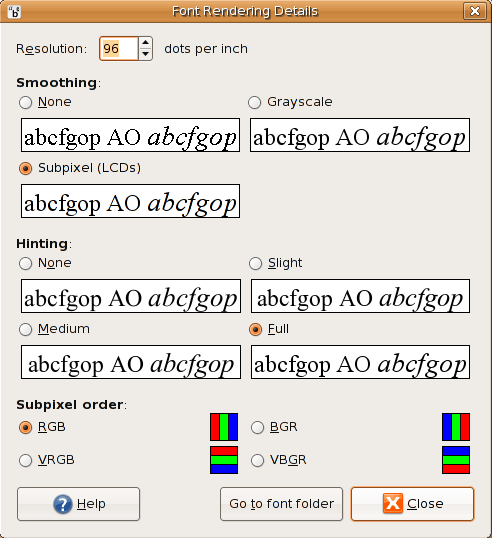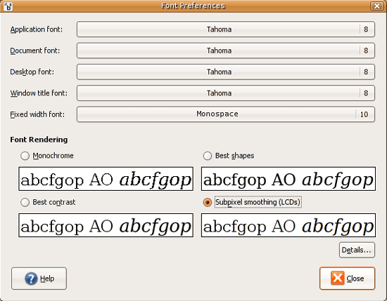 Wähle sowohl Tahoma (8 pt.) für Application font, Document font, Desktop font, und Window title font als auch Monospace (10 pt.) für Fixed width font aus. Vergewissere Dich, dass Subpixel smoothing (LCDs) aktiviert ist: