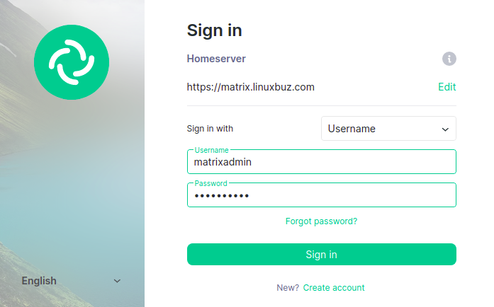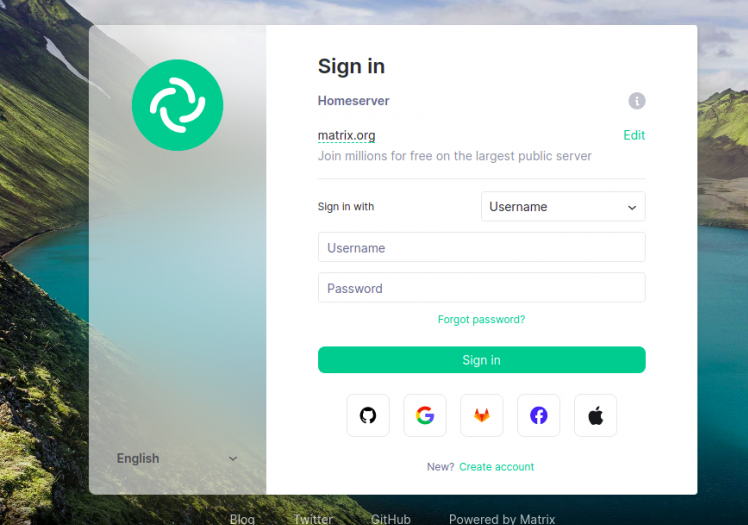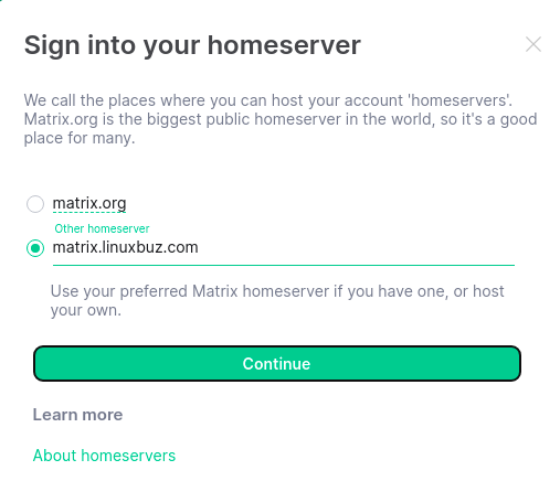 Gib die URL deines Matrix-Servers ein und klicke auf die Schaltfläche “ Weiter“. Du solltest die Matrix-Anmeldeseite sehen: