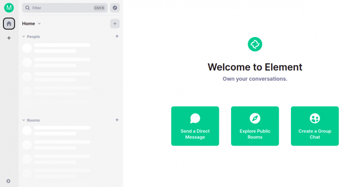 Gib deinen Admin-Benutzernamen und dein Passwort ein und klicke auf die Schaltfläche „ Anmelden „. Sobald du mit dem Matrix-Synapse-Server verbunden bist. Du solltest den folgenden Bildschirm sehen: