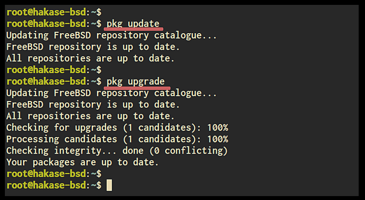 Zunächst aktualisieren wir das Paket-Repository und führen ein Upgrade aller Pakete auf die neueste Version durch. Dazu verwenden wir das Paketverwaltungsprogramm pkg für FreeBSD.