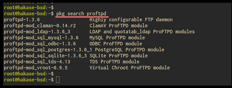 In diesem Schritt installieren wir das ProFTPd-Paket. Das FreeBSD-Repository stellt das ProFTPd-Paket und ein weiteres Modul für die Backend-Datenbank bereit, zum Beispiel ein Modul für MySQL-, PostgreSQL- und SQLite-Datenbanken.