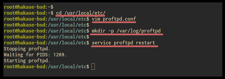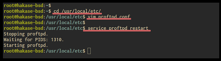Gehe in das Verzeichnis „/usr/local/etc“ und bearbeite die Konfigurationsdatei „proftpd.conf“ mit dem Editor vim.