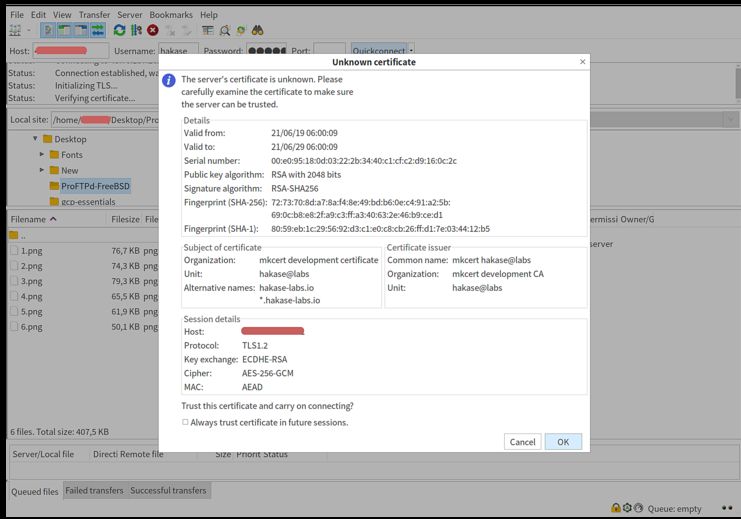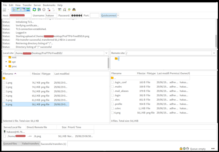 Daraufhin wirst du mit dem ProFTPd-Server verbunden. Und du kannst deine Dateien sicher über den ProFTPd-Server übertragen, wenn SSL/TLS aktiviert ist.