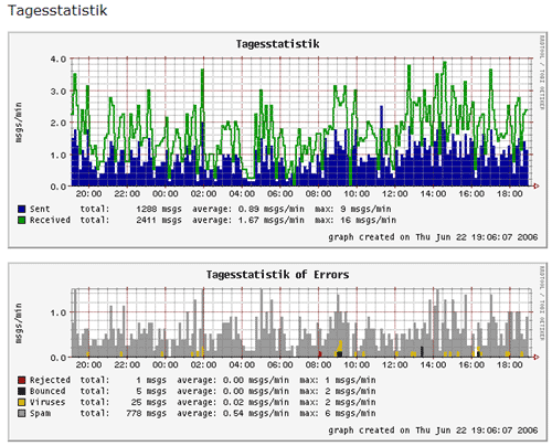 Bitte Merke: Mailgraph zeigt Spam und Viren nur dann an, wenn ein Content-Filter wie amavisd-new in Postfix integriert ist, der konfiguriert ist, SpamAssassin und ClamAV zu verwenden um Spam und Viren-Mails zu identifizieren. Wenn Du das nicht tust, wirst Du immer noch Grafiken sehen können, jedoch ohne Spam- und Viren-Bericht.