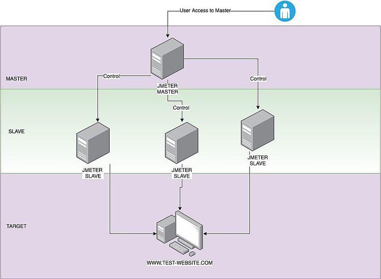 Durch die Verwendung von JMeter im Cluster-Design können Sie sicherstellen, dass Ihre Tests die Möglichkeit haben, ein lokales JMeter (Master) zu haben, das die Testausführung zusammen mit mehreren entfernten JMeter-Instanzen (Slaves), die die Anforderung an Ihren Zielserver senden, handhabt.