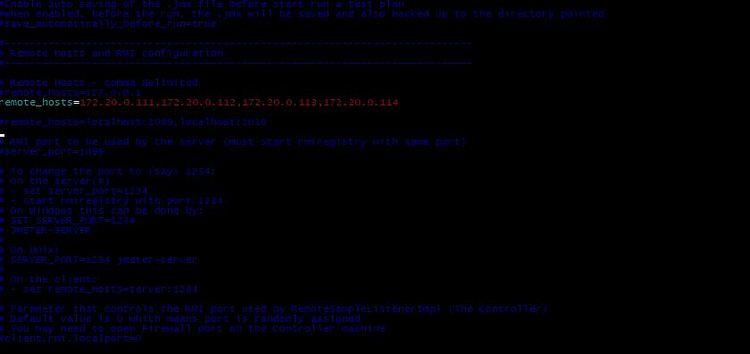 Beachten Sie, dass ich alle unsere JMeter-Server in die JMeter-Konfigurationsdatei aufgenommen habe. Standardmäßig ist die Konfiguration als remote_hosts=127.0.0.1 angegeben. Für diese Konfiguration müssen Sie sie nur unter JMeter-Server konfigurieren, die als Master zugewiesen sind.