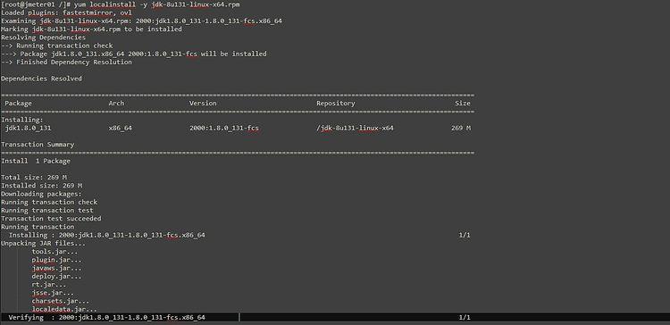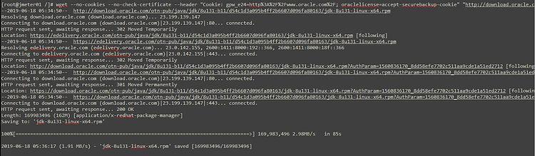 [root@jmeter01 /]# wget --no-cookies --no-check-certificate --header "Cookie: gpw_e24=http%3A%2F%2Fwww.oracle.com%2F; oraclelicense=accept-securebackup-cookie" "http://download.oracle.com/otn-pub/java/jdk/8u131-b11/d54c1d3a095b4ff2b6607d096fa80163/jdk-8u131-linux-x64.rpm" [root@jmeter01 /]# yum localinstall -y jdk-8u131-linux-x64.rpm
