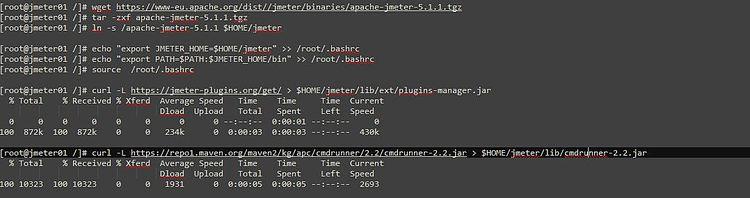 [root@jmeter01 /]# wget https://www-eu.apache.org/dist//jmeter/binaries/apache-jmeter-5.1.1.tgz [root@jmeter01 /]# tar -zxf apache-jmeter-5.1.1.tgz [root@jmeter01 /]# ln -s /apache-jmeter-5.1.1 $HOME/jmeter [root@jmeter01 /]# echo "export JMETER_HOME=$HOME/jmeter" >> /root/.bashrc [root@jmeter01 /]# echo "export PATH=$PATH:$JMETER_HOME/bin" >> /root/.bashrc [root@jmeter01 /]# source /root/.bashrc [root@jmeter01 /]# curl -L https://jmeter-plugins.org/get/ > $HOME/jmeter/lib/ext/plugins-manager.jar [root@jmeter01 /]# curl -L https://repo1.maven.org/maven2/kg/apc/cmdrunner/2.2/cmdrunner-2.2.jar > $HOME/jmeter/lib/cmdrunner-2.2.jar