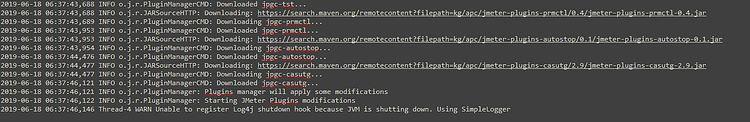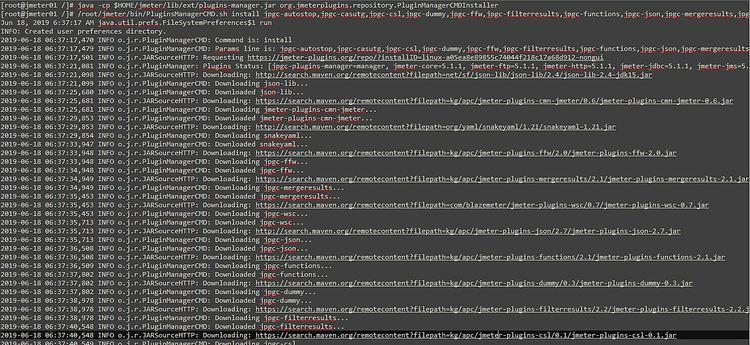 [root@jmeter01 /]# java -cp $HOME/jmeter/lib/ext/plugins-manager.jar org.jmeterplugins.repository.PluginManagerCMDInstaller [root@jmeter01 /]# /root/jmeter/bin/PluginsManagerCMD.sh install jpgc-autostop,jpgc-casutg,jpgc-csl,jpgc-dummy,jpgc-ffw,jpgc-filterresults,jpgc-functions,jpgc-json,jpgc-mergeresults,jpgc-prmctl,jpgc-sense,jpgc-tst,jpgc-wsc
