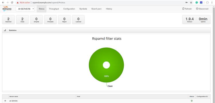 Jetzt können Sie mit einem Browser auf die Rspamd-GUI zugreifen und detaillierte Statistiken über die Spam-Filterrate und den Durchsatz erhalten.