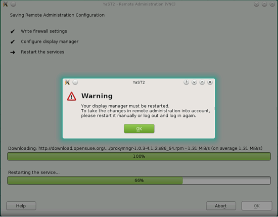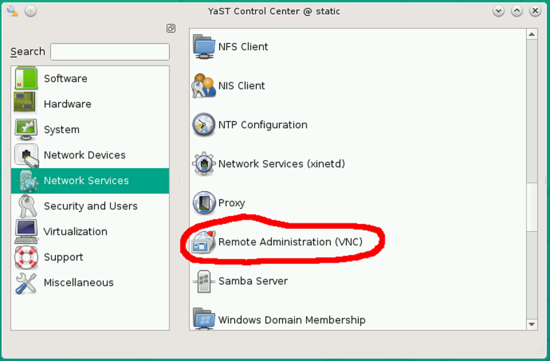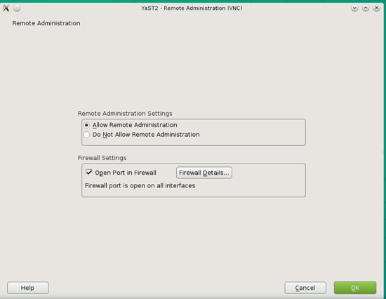 Dann gehe im Yast Dienstprogramm zu Network Service –> Remote Administration (VNC)