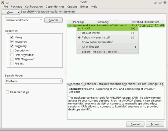 Und Suche nach der Software kdenetwork3-vnc, wähle die Software und installiere sie:
