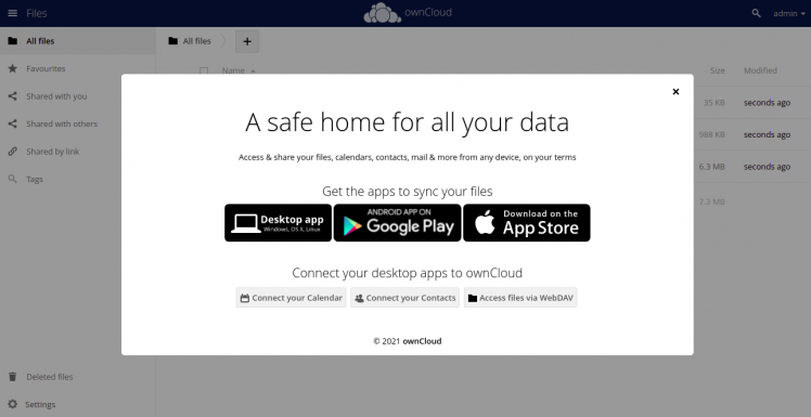 Klicke auf die Schaltfläche Schließen, um das Fenster zum Herunterladen der Anwendung zu schließen. Auf der folgenden Seite solltest du das OwnCloud Dashboard sehen: