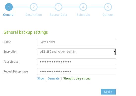 Legen Sie einen Namen für den Auftrag und eine Passphrase für die Verschlüsselung fest. Sie benötigen die Passphrase, um Dateien wiederherzustellen. Wählen Sie also ein sicheres Passwort und stellen Sie sicher, dass Sie es nicht vergessen: