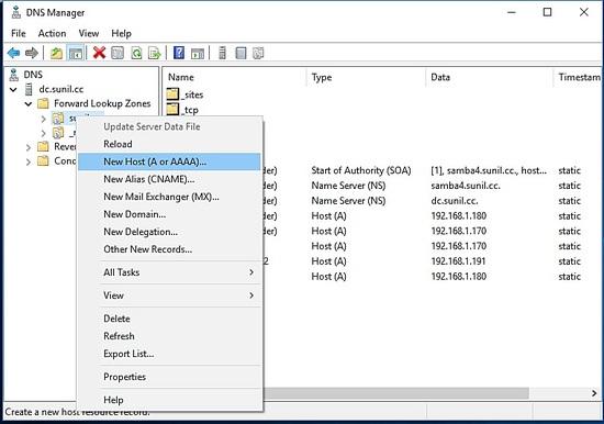 [root@dc ~]# cat /etc/hosts 127.0.0.1 localhost localhost.localdomain localhost4 localhost4.localdomain4 ::1 localhost localhost.localdomain localhost6 localhost6.localdomain6 192.168.1.180 samba4.sunil.cc samba4 192.168.1.170 dc.sunil.cc dc [root@dc ~]#