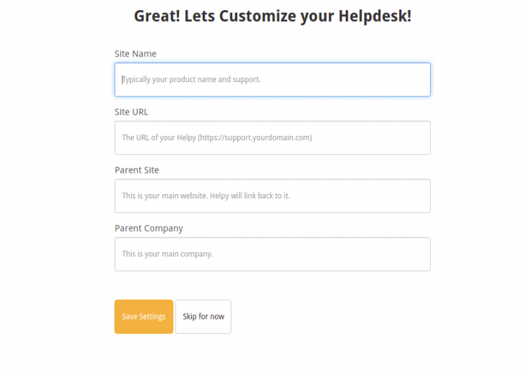Passe deinen Helpdesk nach deinen Bedürfnissen an, ansonsten klicke auf die Schaltfläche Vorläufig überspringen. Du solltest den Bildschirm zur Konfiguration des SMTP-Servers sehen: