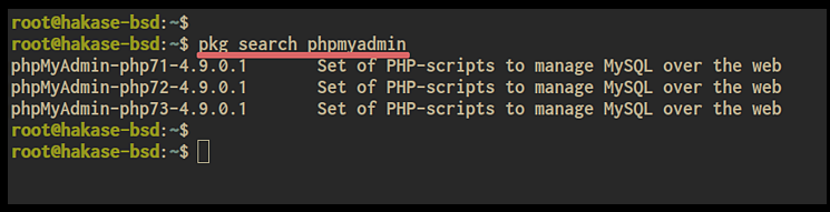 Um eine Liste aller verfügbaren phpMyAdmin-Pakete im FreeBSD-Repository zu erhalten, kannst du den Befehl pkg search (siehe unten) verwenden.