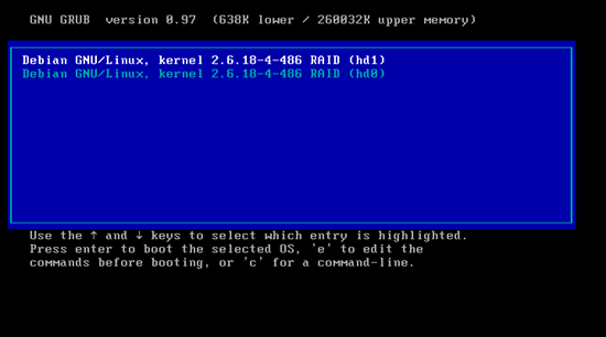 [...] ## ## End Default Options ## title Debian GNU/Linux, kernel 2.6.18-4-486 RAID (hd1) root (hd1,0) kernel /vmlinuz-2.6.18-4-486 root=/dev/md2 ro initrd /initrd.img-2.6.18-4-486 savedefault title Debian GNU/Linux, kernel 2.6.18-4-486 RAID (hd0) root (hd0,0) kernel /vmlinuz-2.6.18-4-486 root=/dev/md2 ro initrd /initrd.img-2.6.18-4-486 savedefault #title Debian GNU/Linux, kernel 2.6.18-4-486 #root (hd0,0) #kernel /vmlinuz-2.6.18-4-486 root=/dev/sda3 ro #initrd /initrd.img-2.6.18-4-486 #savedefault #title Debian GNU/Linux, kernel 2.6.18-4-486 (single-user mode) #root (hd0,0) #kernel /vmlinuz-2.6.18-4-486 root=/dev/sda3 ro single #initrd /initrd.img-2.6.18-4-486 #savedefault ### END DEBIAN AUTOMAGIC KERNELS LIST |