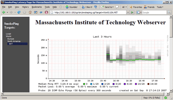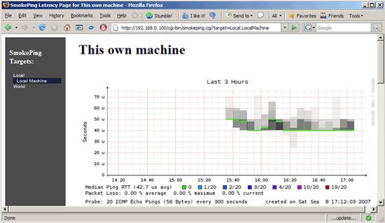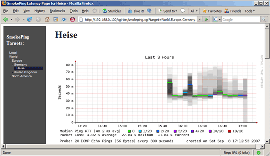 Diese Anleitung veranschaulicht, wie man Smokeping auf Debian Etch installiet und konfiguriert um die Netzwerk-Latenz zu überwachen. Von der Smokeping web site: „SmokePing is a deluxe latency measurement tool. It can measure, store and display latency, latency distribution and packet loss. SmokePing uses RRDtool to maintain a longterm data-store and to draw pretty graphs, giving up to the minute information on the state of each network connection.“