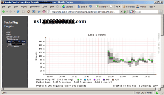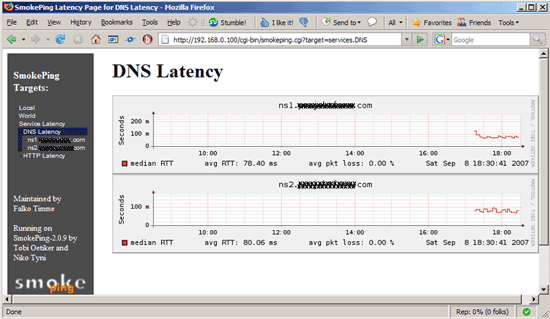 [...] + services menu = Service Latency title = Service Latency (DNS, HTTP) ++ DNS probe = DNS menu = DNS Latency title = DNS Latency +++ dns1 host = ns1.example.com +++ dns2 host = ns2.example.com ++ HTTP probe = Curl menu = HTTP Latency title = HTTP Latency +++ server1 menu = server1 title = HTTP Latency for server1 host = server1.example.com +++ server2 menu = server2 title = HTTP Latency for server2 host = server2.example.com #+++ server3 #menu = server3 #title = HTTP Latency for server3 (port 8080!) #host = server3.example #urlformat = http://%host%:8080/ #++ FTP #probe = Curl #menu = FTP Latency #title = FTP Latency #urlformat = ftp://%host%/ #+++ server1 #menu = server1 #title = FTP Latency for server1 #host = server1.example.com #+++ server2 #menu = server2 #title = FTP Latency for server2 #host = server2.example.com  |