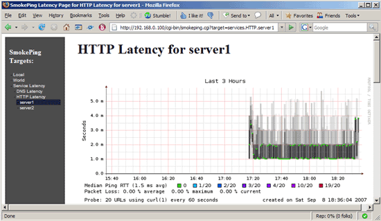 Nach einigen Minuten solltest Du einige Daten für Deine neuen Tests im Smokeping Web Interface (http://www.example.com/cgi-bin/smokeping.cgi) sehen: