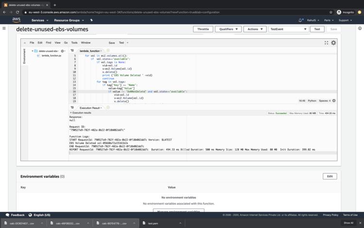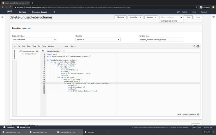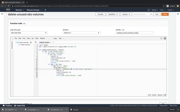 Verwende den folgenden Code, um die ungenutzten EBS Volumes zu löschen. Lösche den bestehenden Funktionscode und füge den folgenden Code in das Funktionscodefeld ein. Wenn du die ungenutzten EBS Volumes nicht löschen willst, markiere sie als „Name: DND“. Der folgende Code wird solche Volumes nicht löschen.