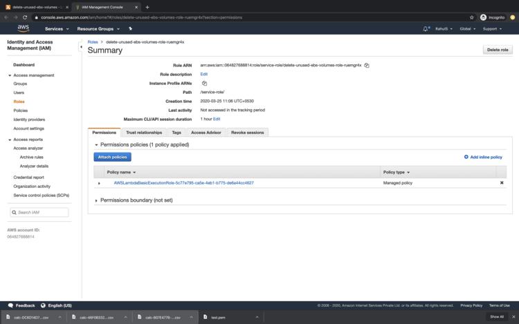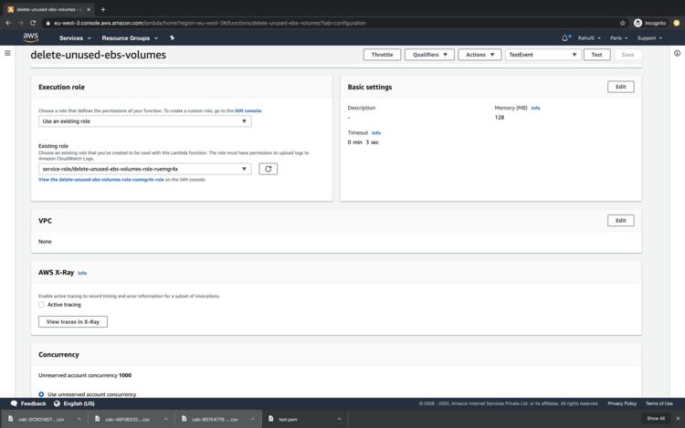 Wenn der Code und das Ereignis fertig sind, müssen wir der Lambda-Funktion noch die erforderlichen Richtlinien zuweisen, bevor wir die Funktion testen oder ausführen können. Um die erforderliche Richtlinie zuzuweisen, scrolle nach unten und klicke auf „View the delete-unused-ebs-volumes-role-ruemgr4x role“ und öffne sie in einem neuen Fenster.