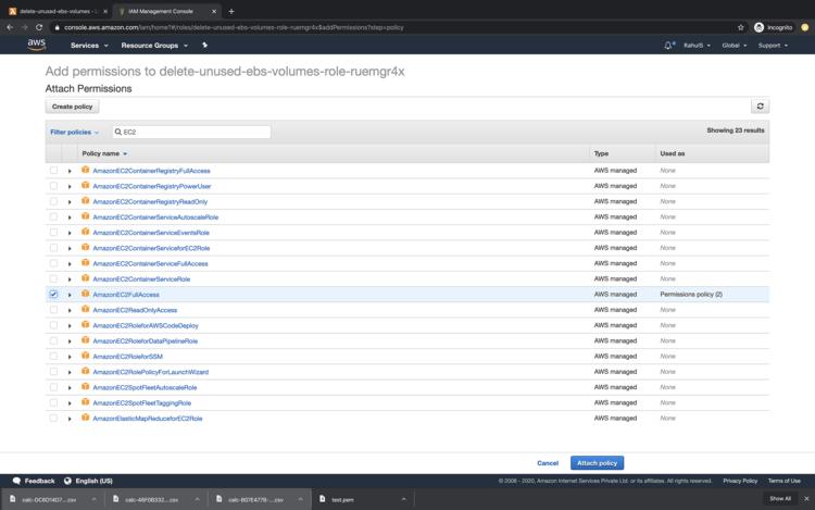 Suche nach EC2 und füge die Richtlinie „AmazonEC2FullAccess“ hinzu. Diese Richtlinie gewährt vollen Zugriff auf die Lambda-Funktion auf EC2-Instanzen.