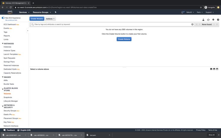 Scrolle im Haupt-Dashboard von EC2 nach unten und klicke auf „Volumes“ unter „Elastic Block Speicher„.