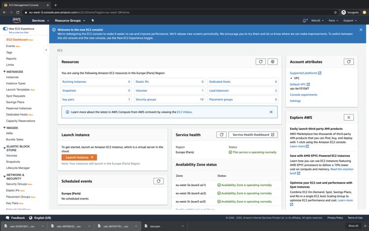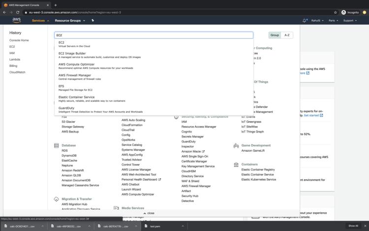 Klicke oben links auf „Services“, suche nach „EC2“ und gehe zum Haupt-Dashboard von EC2.