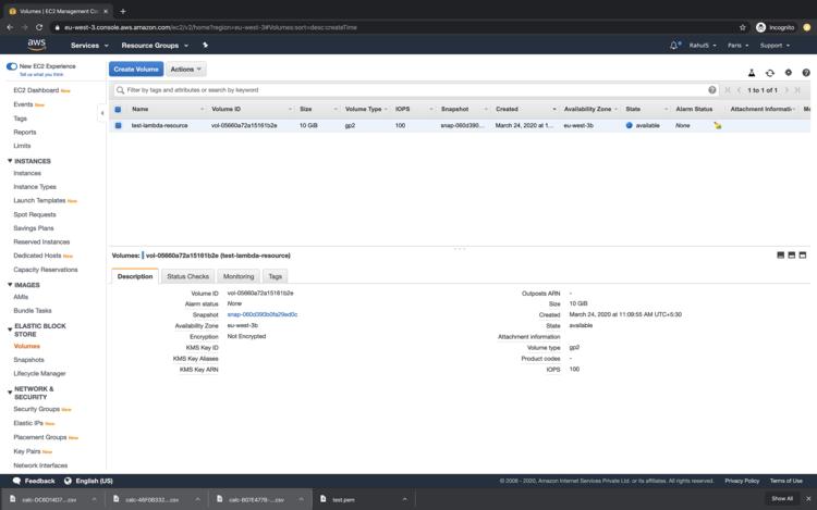 Hier siehst du, dass das ungenutzte EBS-Volumen in der Konsole nicht mehr verfügbar ist, was bedeutet, dass es von der Lambda-Funktion erfolgreich gelöscht wurde.