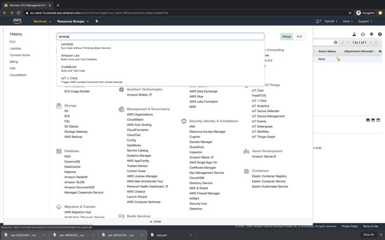 Um das Löschen von ungenutzten Volumes zu automatisieren, können wir „Lambda-Funktionen“ verwenden. Klicke oben links auf dem Bildschirm auf „Dienste“ und suche nach „Lambda“.