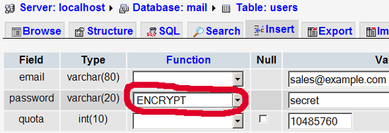 INSERT INTO `users` (`email`, `password`, `quota`) VALUES (’sales@example.com‘, ENCRYPT(’secret‘), 10485760);