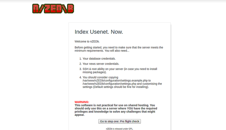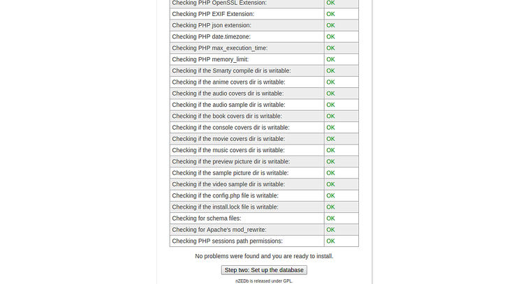 nZEDb ist nun installiert und konfiguriert. Als Nächstes öffnest du deinen Webbrowser und gibst die URL http://your-ip-address/install ein. Du wirst auf die folgende Seite weitergeleitet: