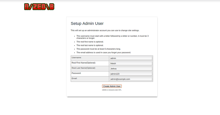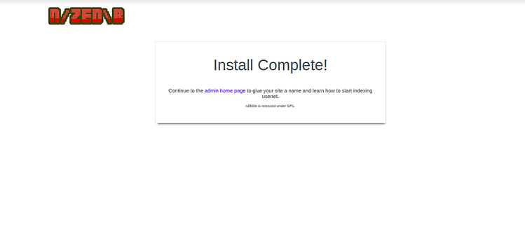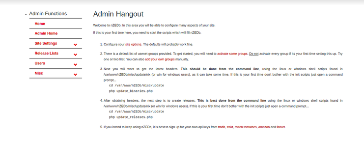 Klicke jetzt auf die Schaltfläche „Admin-Homepage“. Auf der folgenden Seite wirst du zum Standard-Dashboard von nZEDb weitergeleitet:
