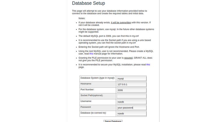 MariaDB [(none)]>create database nzedb; MariaDB [(none)]>grant all privileges on nzedb.* to 'nzedb'@'localhost' identified by 'your-password';
