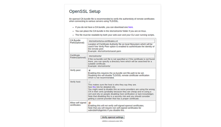 Als Nächstes gibst du deinen Standard-CA-Bündelpfad und den Zertifikatsordner an. Klicke dann auf die Schaltfläche Openssl-Einstellungen überprüfen. Du solltest die folgende Seite sehen: