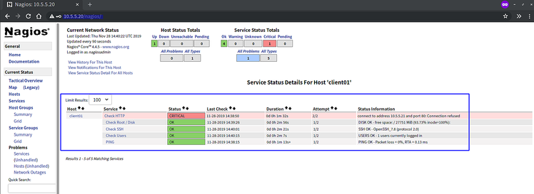 Klicke nun auf den Namen des Hosts ‚client01‘ und du erhältst Details zu den Diensten, die für den ‚client01‘ Server überwacht werden.