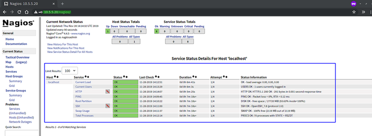 Sobald du dich eingeloggt hast, siehst du das Nagios-Dashboard wie unten abgebildet.