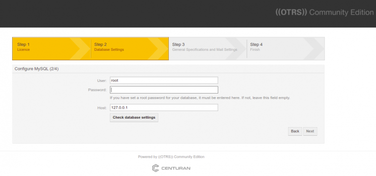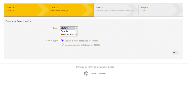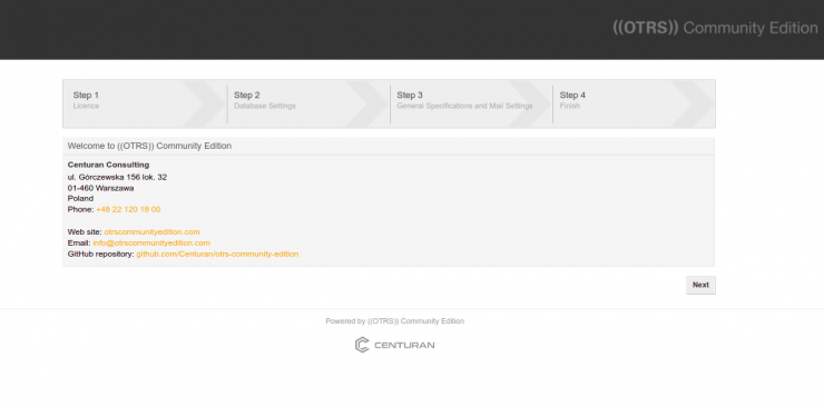 Öffne nun deinen Webbrowser und rufe die OTRS-Weboberfläche über die URL http://your-server-ip/otrs/installer.pl auf. Du solltest den folgenden Bildschirm sehen:
