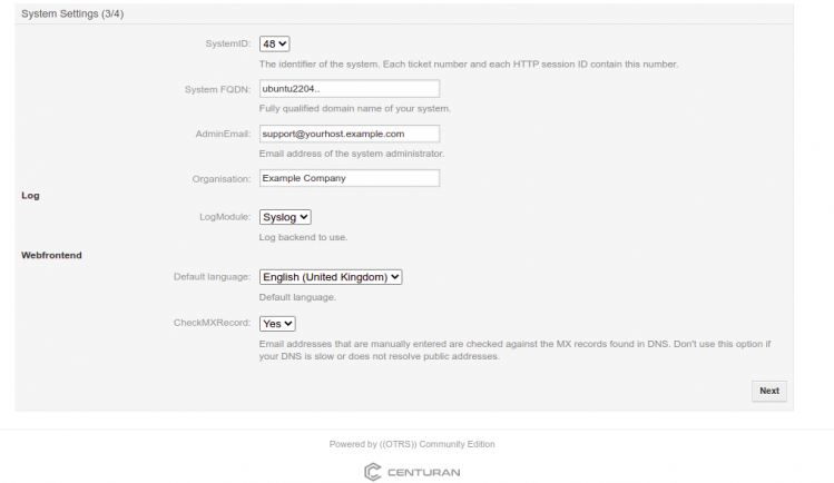 Klicke auf die Schaltfläche Weiter. Du solltest den Bildschirm mit den Systemeinstellungen sehen: