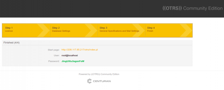 Lege deinen SMTP-Server fest oder lass ihn leer und klicke auf die Schaltfläche Diesen Schritt überspringen. Sobald die Installation abgeschlossen ist. Auf dem folgenden Bildschirm solltest du die Server-URL mit Benutzernamen und Passwort sehen: