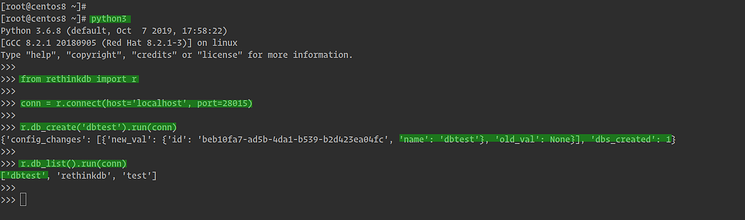 Die Rethink DB läuft also auf dem CentOS 8 Server.